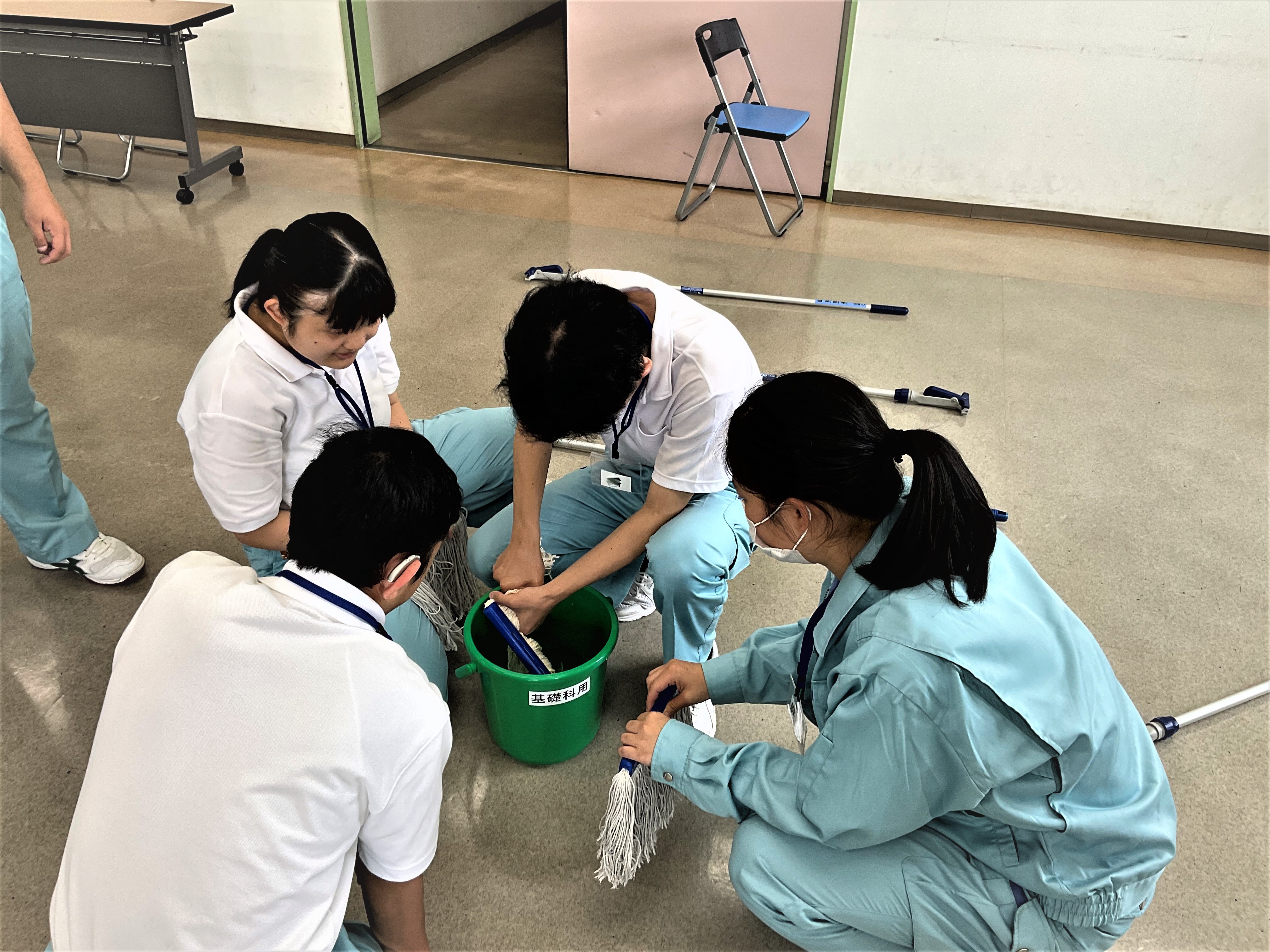 モップの扱い方の見本を見せていただき、実際に練習したり